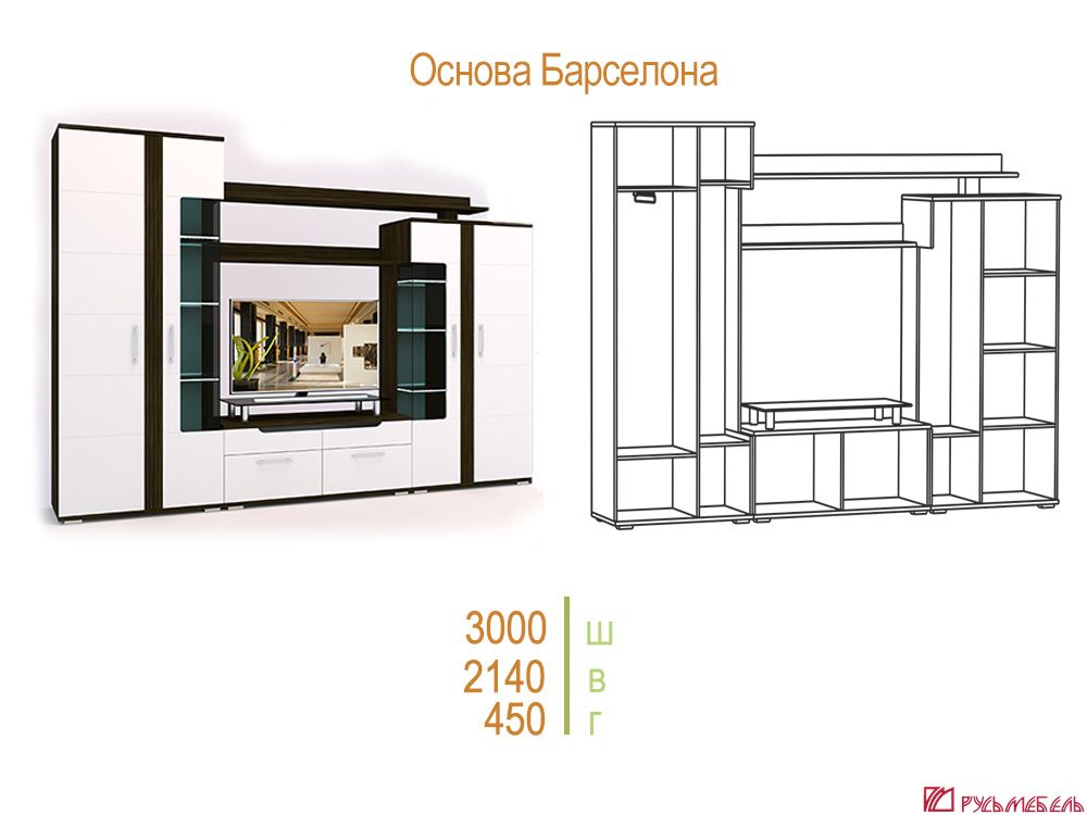 Привлекательная и функциональная гостиная БАРСЕЛОНА - это идеальное решение для создания стильной и уютной обстановки в доме. Шкафы, отделения со стеклом и открытые полки зрительно облегчают стенку, а небольшая глубина позволяет разместить ее даже в небольшом помещении. Шариковые направляющие обеспечивают плавное движение ящиков.