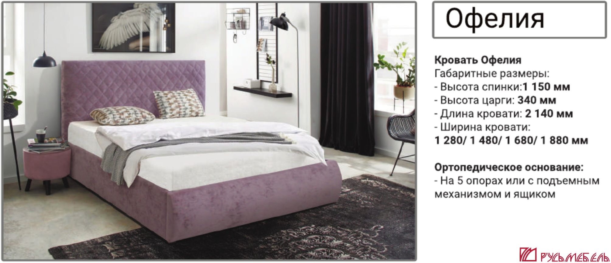 Кровать ОФЕЛИЯ станет украшением вашей спальни. Красивый дизайн, высокая комфортная спинка и мягкая "уютная" ткань не оставят Вас равнодушными. Кровать комплектуется разборным металлическим основанием с подъемным механизмом. Внутри имеется ящик для хранения.